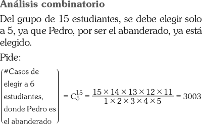 De un grupo de 15 estudiantes, en el cual se encuentra Pedro, ¿de cuántas maneras se puede elegir a 6 personas, donde Pedro es el abanderado?
