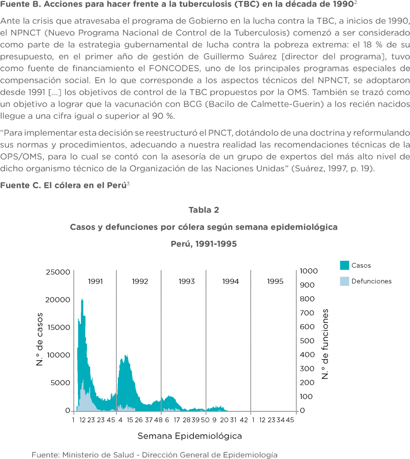 FONCODES, uno de los principales programas especiales de compensación social. En lo que corresponde a los aspectos técnicos del NPNCT, se adoptaron desde 1991 […] los objetivos de control de la TBC propuestos por la OMS. También se trazó como un objetivo a lograr que la vacunación con BCG (Bacilo de Calmette-Guerin) a los recién nacidos llegue a una cifra igual o superior al 90 %. “Para implementar esta decisión se reestructuró el PNCT, dotándolo de una doctrina y reformulando sus normas y procedimientos, adecuando a nuestra realidad las recomendaciones técnicas de la OPS/OMS, para lo cual se contó con la asesoría de un grupo de expertos del más alto nivel de dicho organismo técnico de la Organización de las Naciones Unidas” (Suárez, 1997, p. 19). Fuente C. El cólera en el Perú